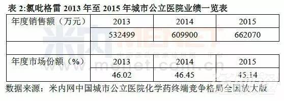 從圖1可以看出,阿卡波糖在2015年中國(guó)城市公立醫(yī)院化學(xué)藥糖尿病用藥的市場(chǎng)份額是15.33%。結(jié)合表1可知阿卡波糖在城市公立醫(yī)院中的年度銷售額逐年增長(zhǎng),2015年的銷售額達(dá)到334867萬(wàn)元。借助進(jìn)入2012版基藥目錄的契機(jī),阿卡波糖將實(shí)現(xiàn)放量增長(zhǎng),仍有較大的成長(zhǎng)空間。