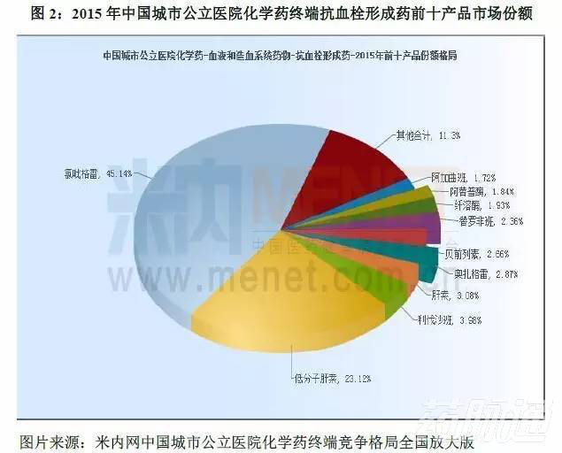 抗血栓藥物根據(jù)作用機(jī)制可以分為抗血小板藥物,抗凝血藥物和溶栓藥物,抗血小板藥物所占市場(chǎng)份額最大??寡“逅幬镙^多,國(guó)內(nèi)主要以氯吡格雷為主。氯吡格雷是賽諾菲的獨(dú)家品種,目前國(guó)內(nèi)生產(chǎn)企業(yè)有賽諾菲(杭州)制藥有限公司、深圳信立泰藥業(yè)和樂普藥業(yè),現(xiàn)已進(jìn)入基藥目錄,屬于醫(yī)保乙類藥。米內(nèi)網(wǎng)數(shù)據(jù)顯示,2015年賽諾菲以63.31%的份額處于領(lǐng)先地位,深圳信立泰藥業(yè)緊隨其后占據(jù)32.71%的份額,而樂普藥業(yè)則占據(jù)3.98%的份額。雖然生產(chǎn)企業(yè)不多,但仍有多家在申報(bào)企業(yè),未來(lái)競(jìng)爭(zhēng)依然激烈。