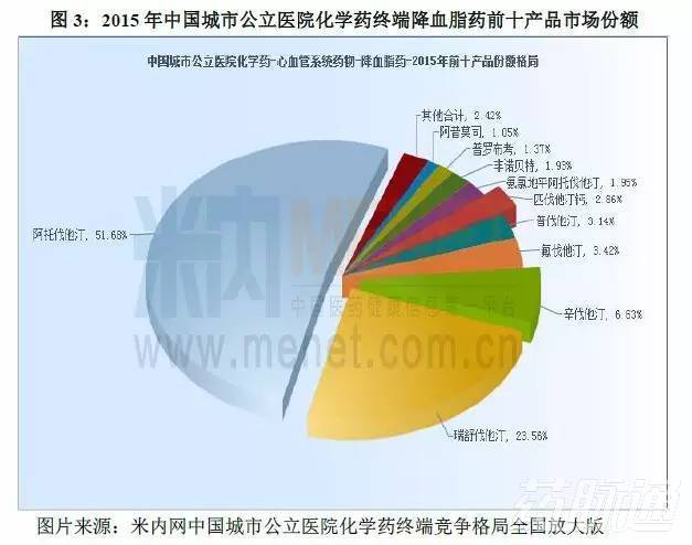 由表3可知2015年城市公立醫(yī)院化學(xué)藥降血脂藥市場(chǎng)中阿托伐他汀的銷售額呈現(xiàn)增長(zhǎng)的趨勢(shì),2015年達(dá)到了615044萬(wàn)元,同比上一年增長(zhǎng)了13%。2015年的市場(chǎng)份額為51.68%,較2013年稍有下降但結(jié)合圖3可知阿托伐他汀以絕對(duì)優(yōu)勢(shì)領(lǐng)先于其他降血脂藥,占據(jù)降血脂藥的半壁江山。