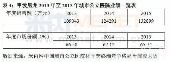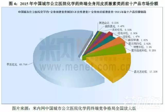 由表4可知甲潑尼龍?jiān)?013年至2015年城市公立醫(yī)院化學(xué)藥全身用皮質(zhì)激素類藥中的銷售額呈現(xiàn)上升的趨勢(shì),2015年的銷售額為132899萬(wàn)元且其所占的年度市場(chǎng)份額較大,結(jié)合圖4可知甲潑尼龍以65.74%的高份額位居榜首,居第二的氫化潑尼松的份額占17.32%,這充分說(shuō)明其在全身用皮質(zhì)激素類藥品中的龍頭地位。
