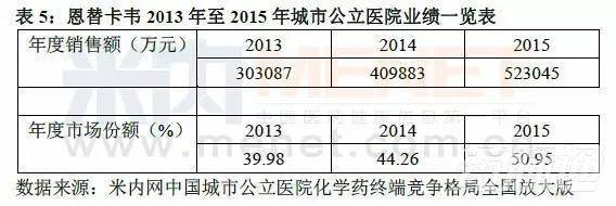 由表5可知恩替卡韋在2013年至2015年城市公立醫(yī)院化學(xué)藥全身用抗病毒藥中的年度銷售額和市場(chǎng)份額均呈現(xiàn)增長(zhǎng)的趨勢(shì),2015年的銷售額達(dá)523045萬(wàn)元,市場(chǎng)份額占到50.95%,結(jié)合圖5可以看出恩替卡韋在全身用抗病毒藥中的絕對(duì)領(lǐng)先地位。