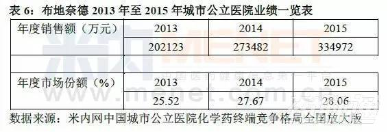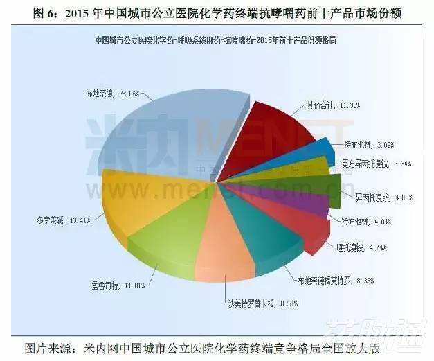 從表6可以清晰地了解到布地奈德2013年至2015年城市公立醫(yī)院化學(xué)藥抗哮喘藥中的銷售額和市場(chǎng)份額均在逐年增長(zhǎng),2015年的銷售額為334972萬(wàn)元,市場(chǎng)份額占比28.06%,結(jié)合圖6可以看出,布地奈德在抗哮喘藥中占據(jù)較大份額。
